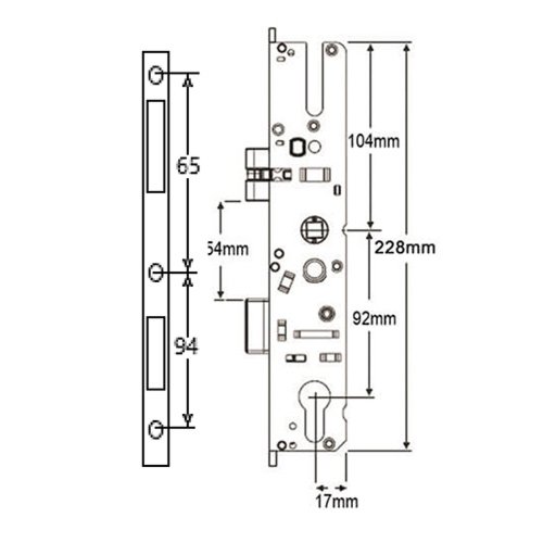 Aubi gearboxes feature lift lever functionality. They measure 228mm high by backset + 18mm wide. The centres (PZ) are 92mm. The latch is 29mm high, the deadbolt is 30mm high and the distance from the bottom of the latch to the top of the deadbolt is 54mm.