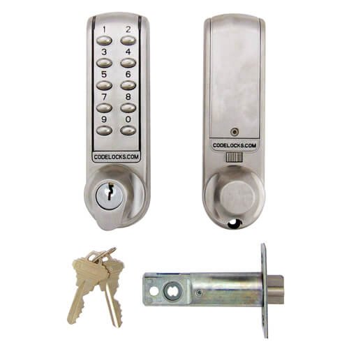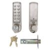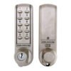 Code length: 4-6 digits Combinations: 1000,000+ Allows up to 80 User Codes Rapid Retrofit for basic Single code mechanical codelocks On door programming via Master Codes in seconds Allows up to 10 One-Time User Codes to be entered Over 80,000 operations from 2 x 1.5 v AA batteries (supplied) LED indicator option PVD weather resistant, low maintenance finish Low battery warning and emergency battery override Connections for remote release by reception desk button, and alarm release included Code Free entry activated electronically from the keypad Door thickness: 35mm – 60mm Backset: 60mm