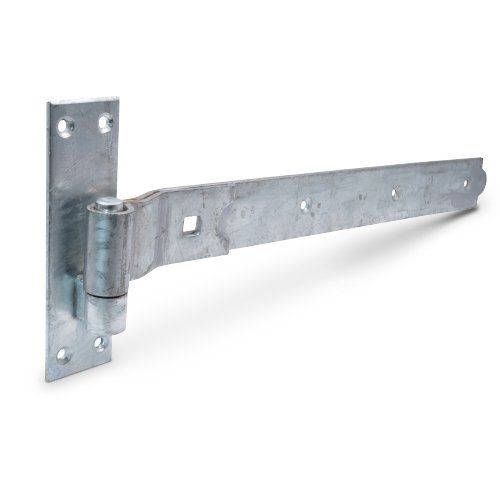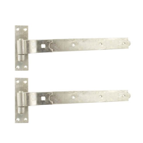 Crompton Cranked folded eye band with hook on plate. These traditional style hinges are ideally suited for use on gates and allow the gate to be lifted off in the open position, for lceaning or maintenance. Sold in pairs, these hinges are galvanised and suitable for use outdoors. These hinges measure 457mm in length.
