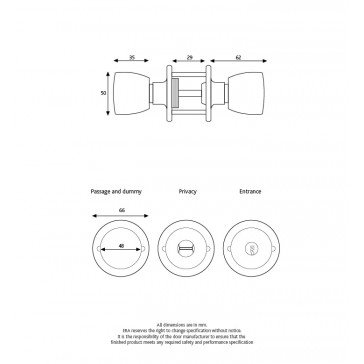 Size/Dimensions Adjustable to 60 or 70mm back set / 50mm dia knob / 67mm dia rose