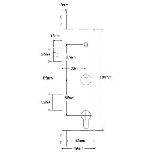 All SL16 gearboxes feature a 68mm centres (PZ) measurement. This is only found on Fullex locks (the FULCCA also has this measurement). The overall case height is 194mm. The case width is the backset + 15mm. The latch is 27mm high, the deadbolt is 32mm high and the distance between the bottom of the latch and the top of the deadbolt is 65mm.