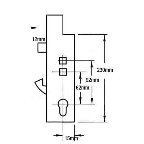 Fullex XL gearboxes are available in 35mm and 45mm backsets in single, double, and split spindle configurations but their dimensions are all the same. They measure 227mm high by the backset + 15mm. These gearboxes attach to their strips with three equidistant screws. The middle screw is 108mm from the top, which is also 108mm from the bottom screw. Fullex XL locks are also known as Vitawin or Vita Scimitar.