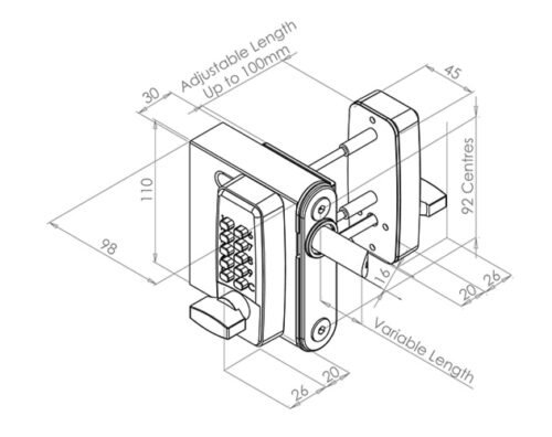 The surface-mounted version of the ProSelect digital code gate lock has a long latching movement allowing for gate expansion and contraction. The lock fits simply to the gate by drilling 3 holes into the gate frame and screw fixing the lock to the gate. Digital gate locks are a convenient method of locking a gate as no keys are required.