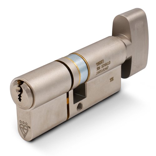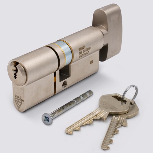 This is the GeGe pExtra Guard TS007 3* Euro Double Cylinder. It is key on both sides and features a sacrificial break slot, which ensures that in the event of the cylinder being snapped, the secure core of the lock is retained within the door preventing forced override of the cylinder. The external snap is on the 1st size measurement.