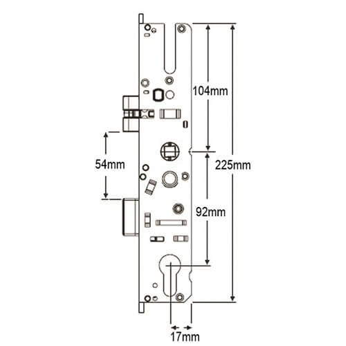 Maco G-TS gearboxes feature lift lever functionality. They measure 228mm high by backset + 18mm wide. The centres (PZ) are 92mm. The latch is 29mm high, the deadbolt is 30mm high and the distance from the bottom of the latch to the top of the deadbolt is 54mm.