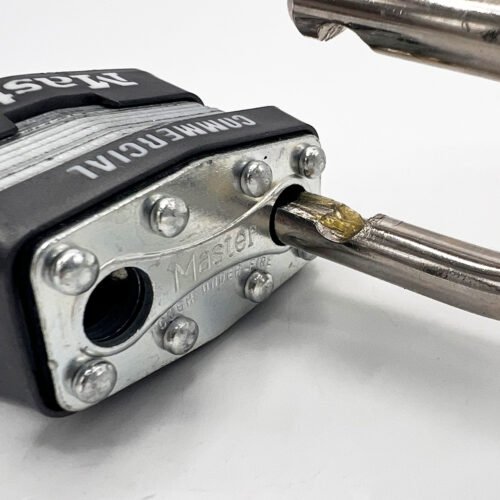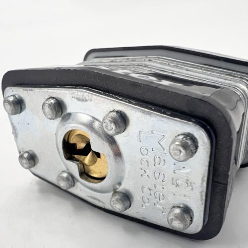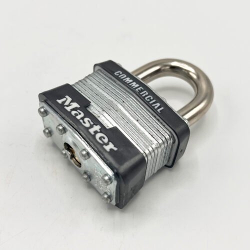 The Master Lock No. 1KA Open Shackle Laminated Steel Padlocks, Keyed Alike – multiple locks open with the same key – feature a 44mm reinforced laminated steel lock body providing extra strength and a 24mm tall, 8mm diameter hardened steel shackle for excellent cut resistance. Dual ball bearings locking for maximum pry resistance, making it ideal for industrial applications.