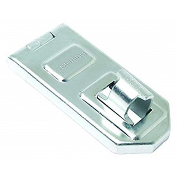 Sterling heavy duty hasp for discus padlock, 120mm, zinc plated tough steel, concealed hinge pin and fixings, hardened steel hinge pin and staple, visi packed including fixings.