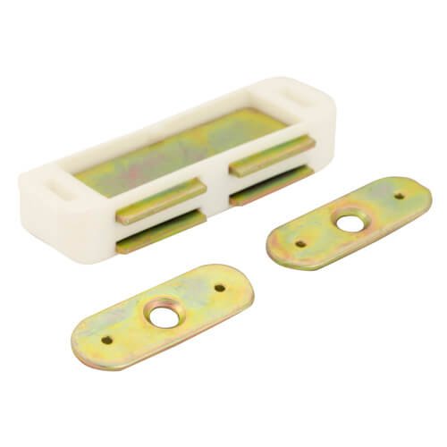 Twin magnetic catch which provides a simple and effective way to keep applications such as cupboard doors, lids and removable panels closed.