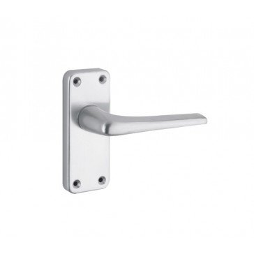 Satin aluminium budget lever door handle on short back plate. Supplied with fixings.