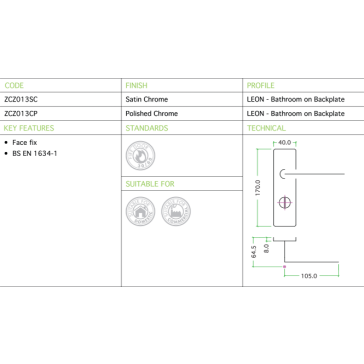 Zoo Leon range of designer lever on plate furniture, chrome plated zinc base material to achieve long performance & good aesthetic appeal – bathroom / PC. Supplied boxed with screws.