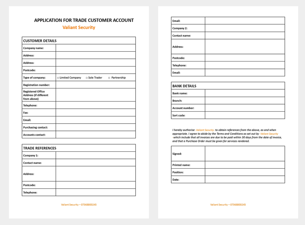 Valiant Security, we value strong and trustworthy relationships with our trade customers. To offer you the convenience of credit terms, we require some essential details to assess your creditworthiness.